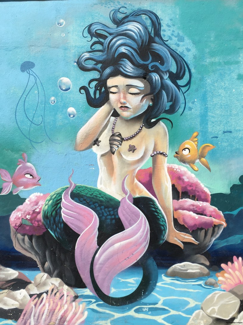 This mermaid is on a wall on the beach in Malaga: a beautiful and bold way to adorn a public loo. This one was an oasis when I discovered it, I’d become rather desperate to find somewhere to pee. The loo I’d used earlier had literally just closed for the evening. I quizzed the attendant in sign language conveying my distress about this and understood the friendly gesture indicating a short walk further along. I’m always happy to locate a good public loo and if it’s pretty too that’s an extra bonus. The next day we set up beach camp a short way away from the marine scene and I wondered why all public conveniences weren’t as clean, free, unisex and beautiful.